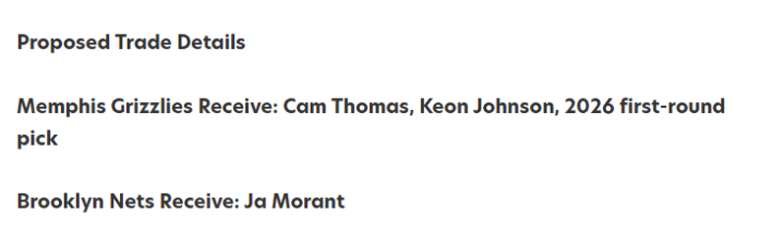 In this regard, the US media listed a set of 3-for-1 trading plans, specifically: the Grizzlies get Cam Thomas (sign first and then exchange) + Zeon Johnson + the first round pick in 26 years, and the Nets get Morant. First of all, the Nets had almost no movement throughout the summer. They were staring at the Warriors and were ready to intercept Hu Kumingga at any time! Cam Thomas and Kumingga are in a very similar situation. The Nets provide a quotation of 1 year, 5.99 million qualifications, and also gave him a 2-year, 28 million contract (a Option to take the team). Either the qualifications offer or accept the terms of the Option to take the team. Thomas was also angry and sought a contract with an average salary of more than 25 million. First of all, for the Nets, this deal needs a real All-Star core, and they have this market demand.