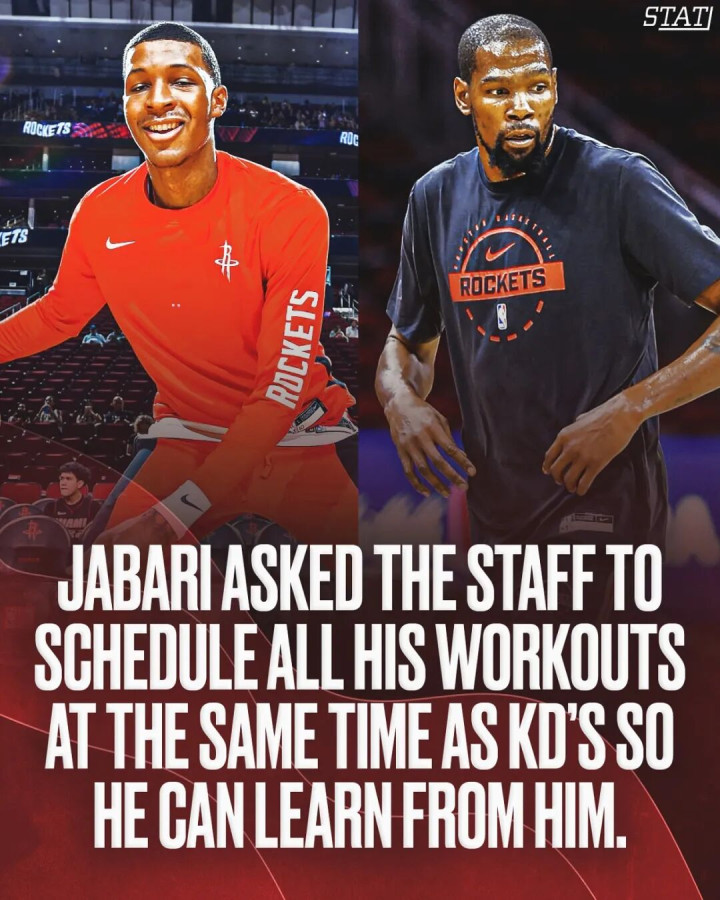 It is reported that he asked the staff to arrange for his training content and time to be the same as Durant's. During the Rockets' warm-up period, little Jabari could often be seen imitating Durant's moves like a "follower".