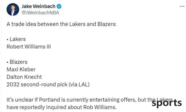 According to famous reporter Jake Weinbach, the Lakers have asked the Trail Blazers for center Robert Williams, but it is not clear whether the Trail Blazers are considering the Lakers' offer. Weinbach also proposed a potential trading plan, with the Lakers sending out Kleber, Kneckett and a 2032 second round pick to exchange for Robert Williams from the Trail Blazers.