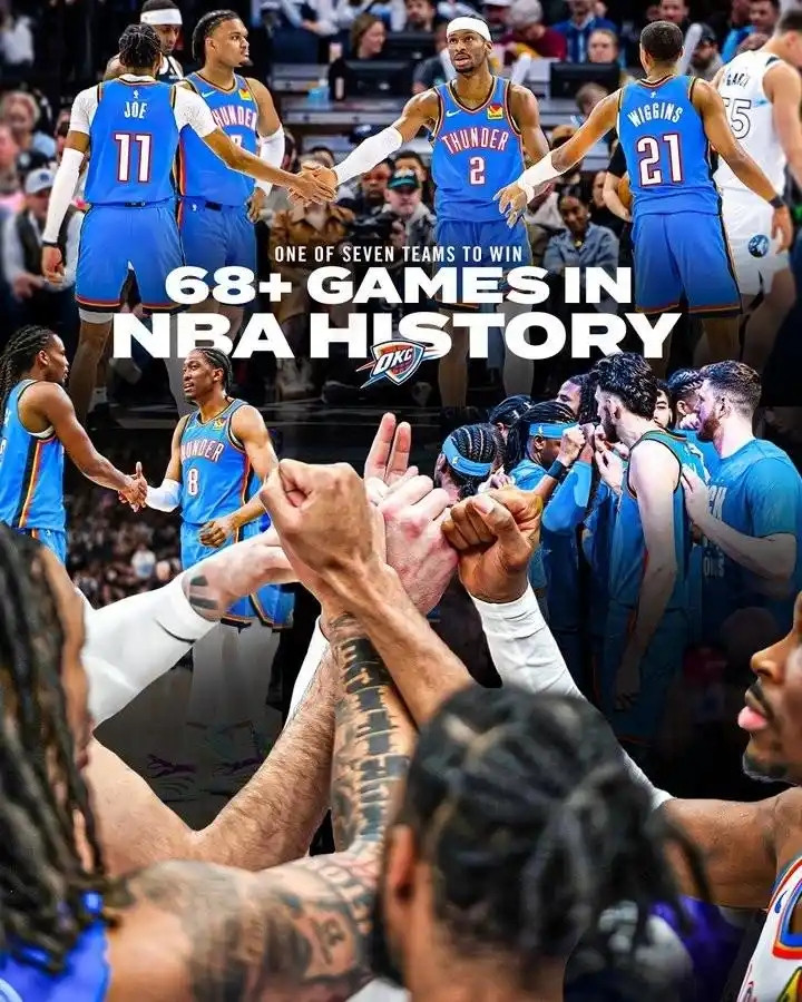 Last season, the Thunder not only successfully won their first championship after moving to Oklahoma City, but also achieved an impressive record of 68 wins and 14 losses in the regular season, becoming the seventh team in history to win at least 68 games in a single season. It was also the team with the most wins after the 73-win Warriors in the 15-16 season.