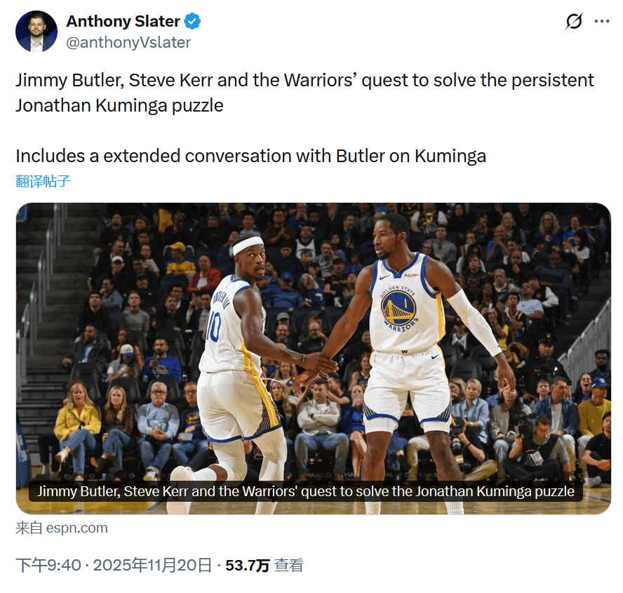 On November 21, the NBA regular season continues. Earlier today, Warriors reporter Anthony Slater wrote an article analyzing the subtle relationship between Kuminga and the Warriors in the new season. Kuminga believes that he has become a scapegoat for the Warriors' poor record, and Butler has always played a mediating role.