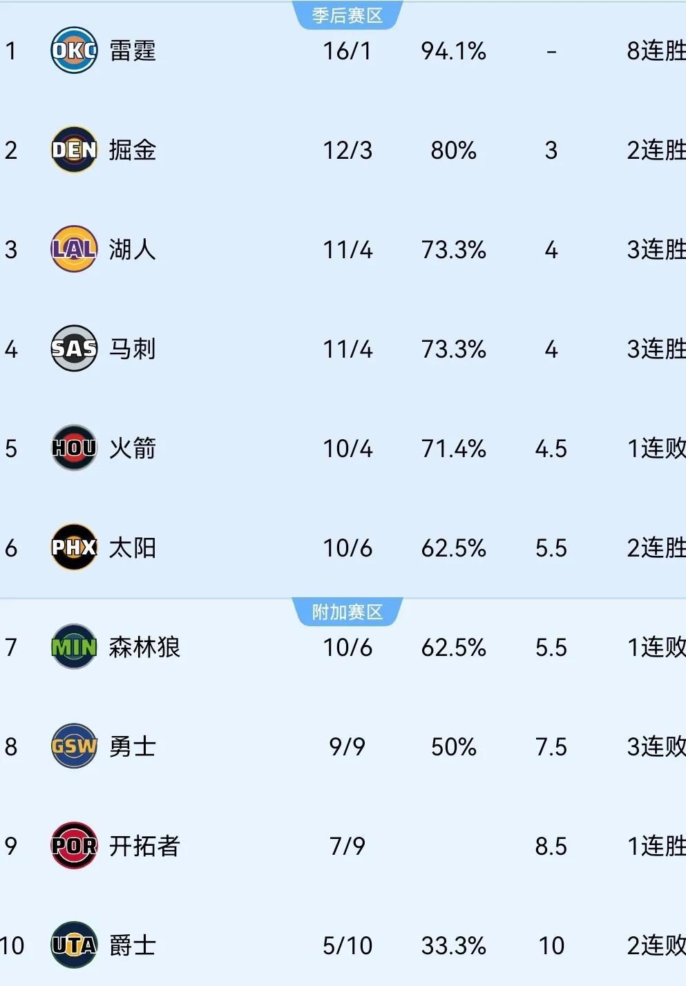 So far, the Rockets have 10 wins and 4 losses and are ranked fifth in the Western Conference. The Nuggets are ranked second in the Western Conference with 12 wins and 3 losses, second only to the Thunder (16 wins and 1 loss). The Lakers are third in the Western Conference with 11 wins and 4 losses. The Spurs are also fourth in the Western Conference with 11 wins and 4 losses.
