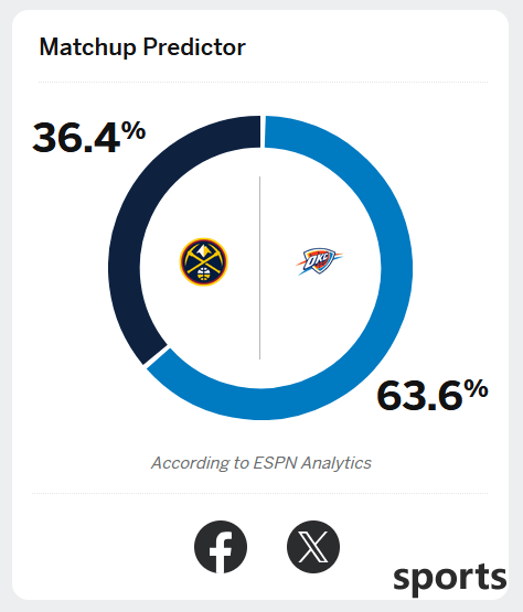 According to the ESPN victory rate forecast, the Nuggets' chance of winning tomorrow is only 36.4%, while the Thunder is as high as 63.6%, which shows that the Nuggets are not optimistic about winning the Battle of Tianwang Mountain.