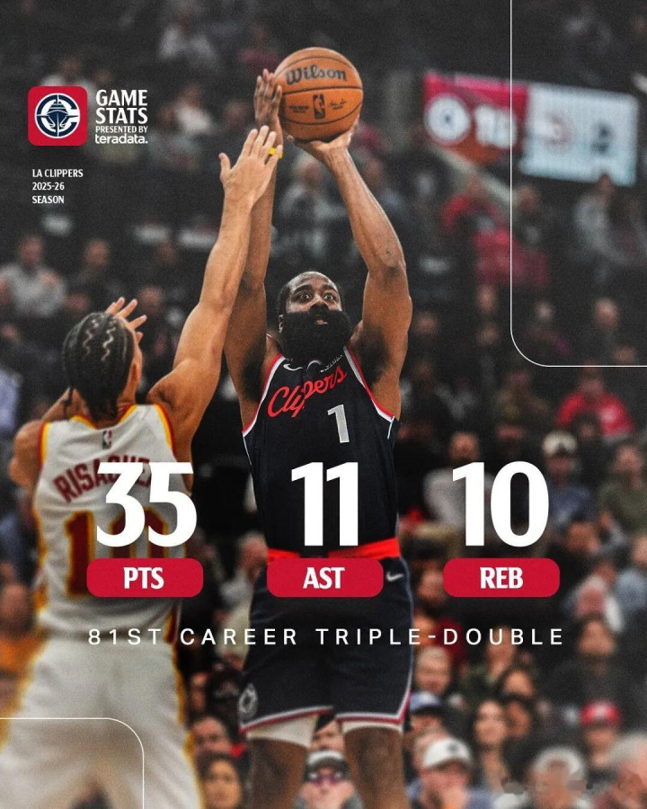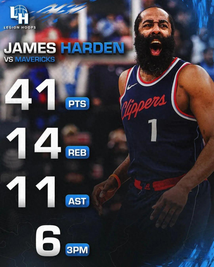 The Clippers narrowly defeated the Mavericks in double overtime. Harden played 51 minutes in this game, made 13 of 25 shots, and scored a triple-double of 41 points, 14 rebounds, and 11 assists. This was Harden's second triple-double in three games and the eighth triple-double of his Clippers career. He surpassed Griffin, Odom, and Bob Kaufman, and ranked first in team history!