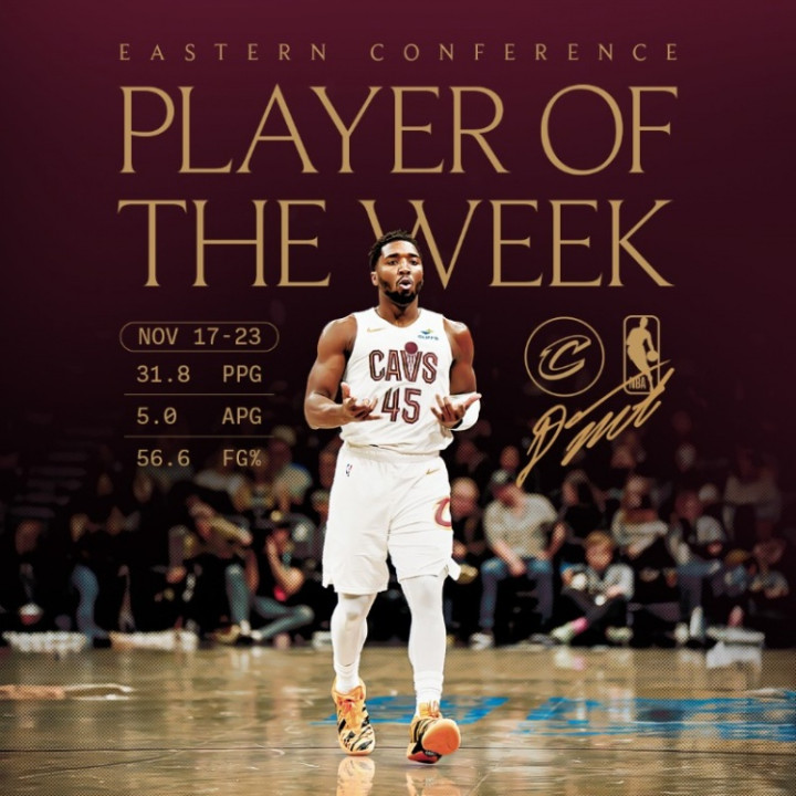 Mitchell led the team to a record of 3 wins and 1 loss last week, averaging 31.8 points, 5 rebounds, 6.3 assists and 1.3 steals per game, shooting 56.6% from the field, 43.2% from the three-point range, and 81% from the free throw line