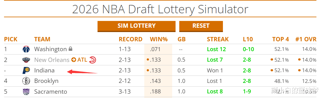 The Pacers lost 14 of 16 games! The probability of the first four picks is 52.1%. US media predicts that Dibansa will be selected to average 20+7 per game.