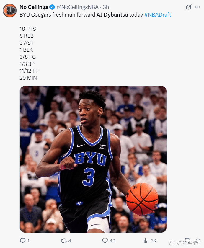 Dibansa currently averages 30 minutes per game in the NCAA, scoring 20.3 points, 6.8 rebounds, 2 assists, 0.8 steals, and 0.3 blocks, with a shooting percentage of 57.4% and a three-point shooting rate of 40%. Dibansa's personal performance is indeed very explosive.