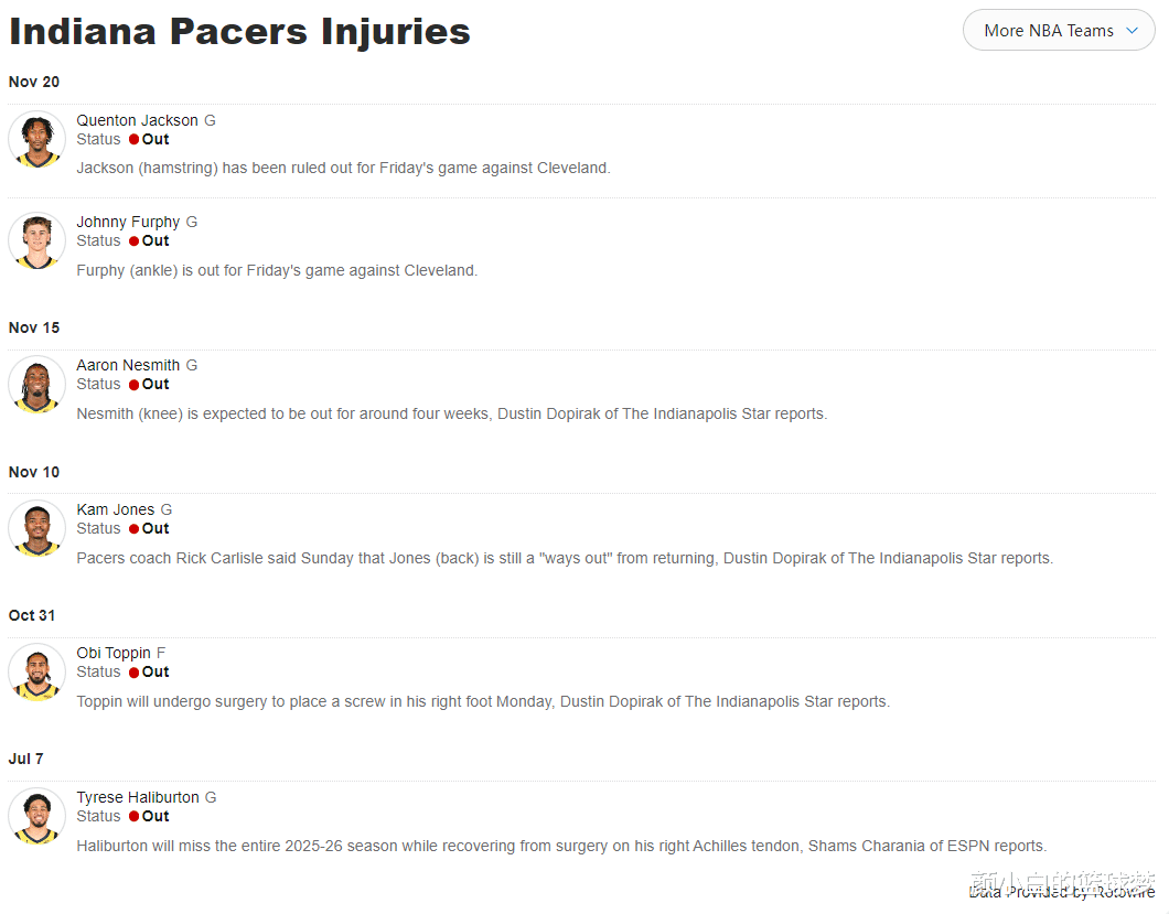 The Pacers are full of injuries. Quentin Jackson has a hamstring strain, Furfe has an ankle sprain, Nesmith has a knee injury, Cam Jones has a lower back strain, Toppin has a right big toe sprain, and Haliburton has a torn right Achilles tendon. Moreover, Nembhard and Marcelin both played with injuries. The Pacers were the Eastern Conference champions last season, and they were unable to recover due to injuries.