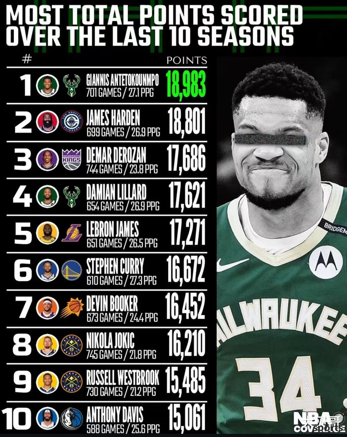 Sixth Curry has risen since 2015. The past 10 years can be said to be Curry's most glorious 10 years. He has won the scoring champion, became the number one scorer in history, and the player with the most three-pointers in history. It also changed the style of play in this era. Curry has scored a total of 16,672 points in the past 10 years and played 610 games. If it weren't for the lower attendance rate, his ranking would be higher. He averaged 27.3 points per game in the past 10 years.