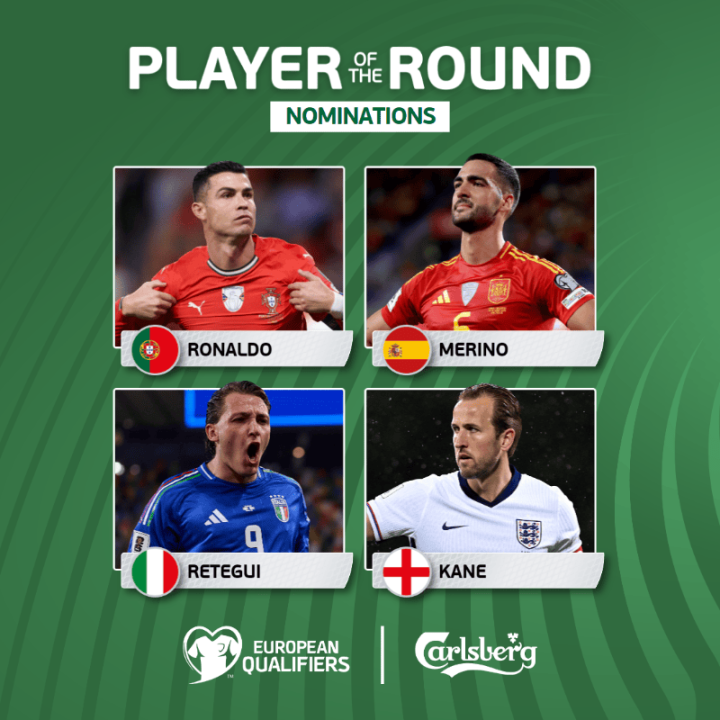 Candidates for the best player in this round of World European preliminaries: Cristiano Ronaldo, Merino, Retegui, Kane are shortlisted