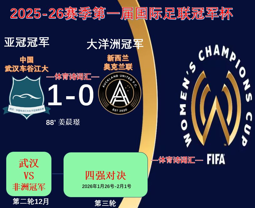 A total of 6 teams participated in the FIFA Champions Cup. After the first round of the Asian champion (Wuhan Eda Chetani) and the Oceania champion (Auckland United) collided, the winner (Wuhan Women's Football Team) will compete with the African champion (produced on November 23) in December. The winner of the second round will advance to the semi-finals and move to London, England to compete with the South American champion (produced on October 18th), the European champion (Arsenal), and the North American champion (Gotham, New Jersey) from January 26th to February 1st next year.