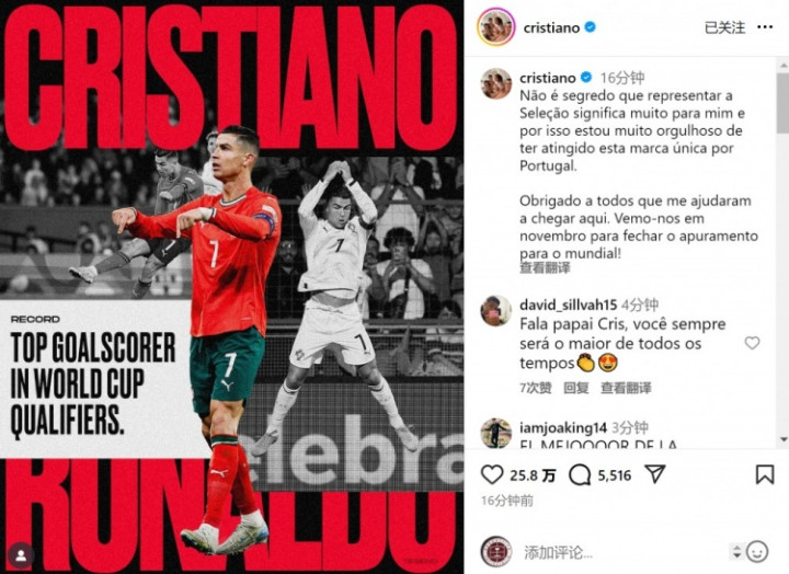 Crowned the top scorer in the World Preliminaries! Ronaldo Social Media: I am proud to have reached a unique milestone for Portugal