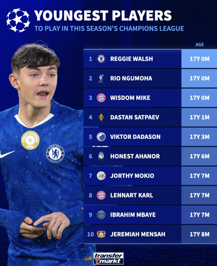 Chelsea's Walsh, Liverpool's Ngumoha and Bayern's Mike are tied for the top spot at 17 years old respectively.