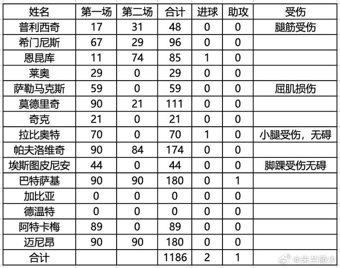 Milan players played a total of 1,186 minutes on this national team match day. Among them, Pavlovich, Bartsakhi, and Maignan had a relatively heavy game load and basically played two games. Next is Modric, who made an appearance in one game, and the other players basically played less than one game.