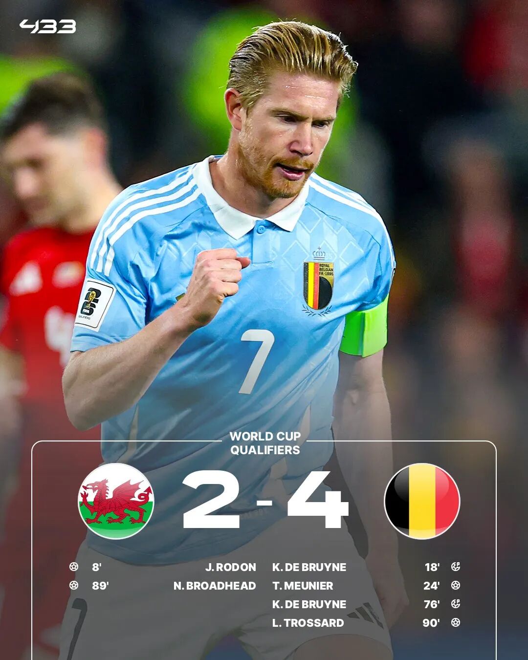 Roden took the lead for Wales, De Bruyne shot to equalize the score, and then Doku assisted Meunier to score. In the second half, De Bruyne scored twice with a penalty shot, Broadhead regained a victory for Wales, and Trossard sealed the victory for Belgium. In the end, Belgium defeated Wales 4-2 away from home.