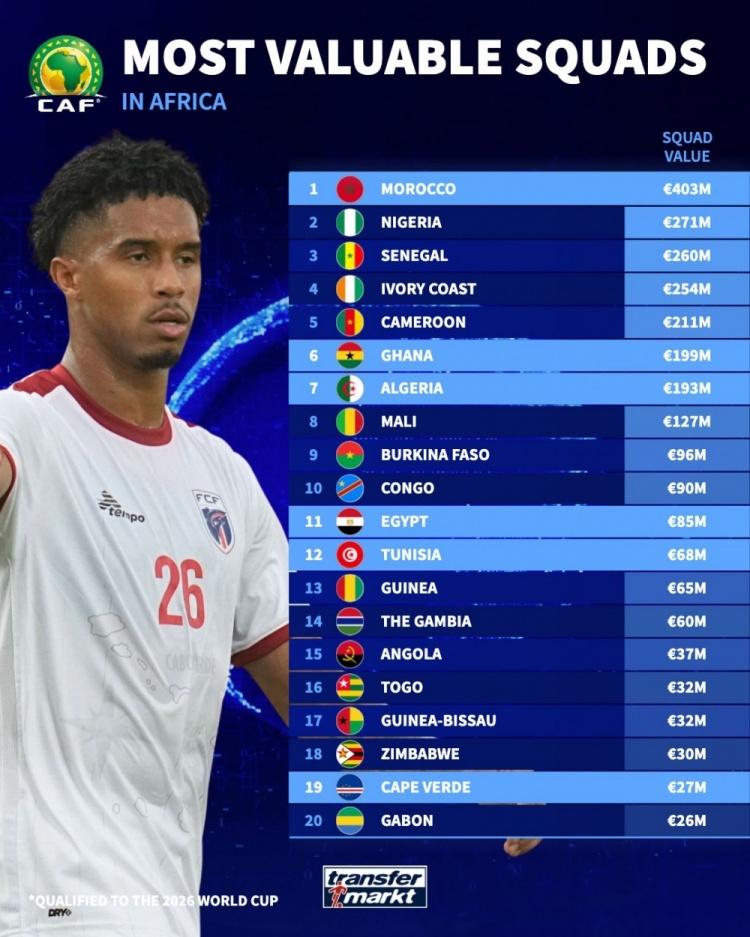 In addition, the German transfer also updated Cape Verde's lineup data. Cape Verde's lineup has a total value of only 27 million euros, ranking only 19th among African teams, and Morocco, the first place, has a total value of 403 million euros.