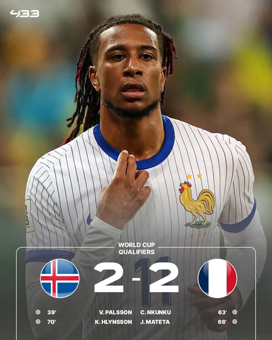 In the 8th round of the World Cup European Qualifiers, Iceland faced France at home. In this game, Mbappe was absent due to injury. The Iceland team seized the opportunity at home. In this campaign, Parsson was blocked and then shot into the net. Nkunku and Mateta scored, and Herinsson tied the score. In the end, Iceland tied with France 2-2 at home.