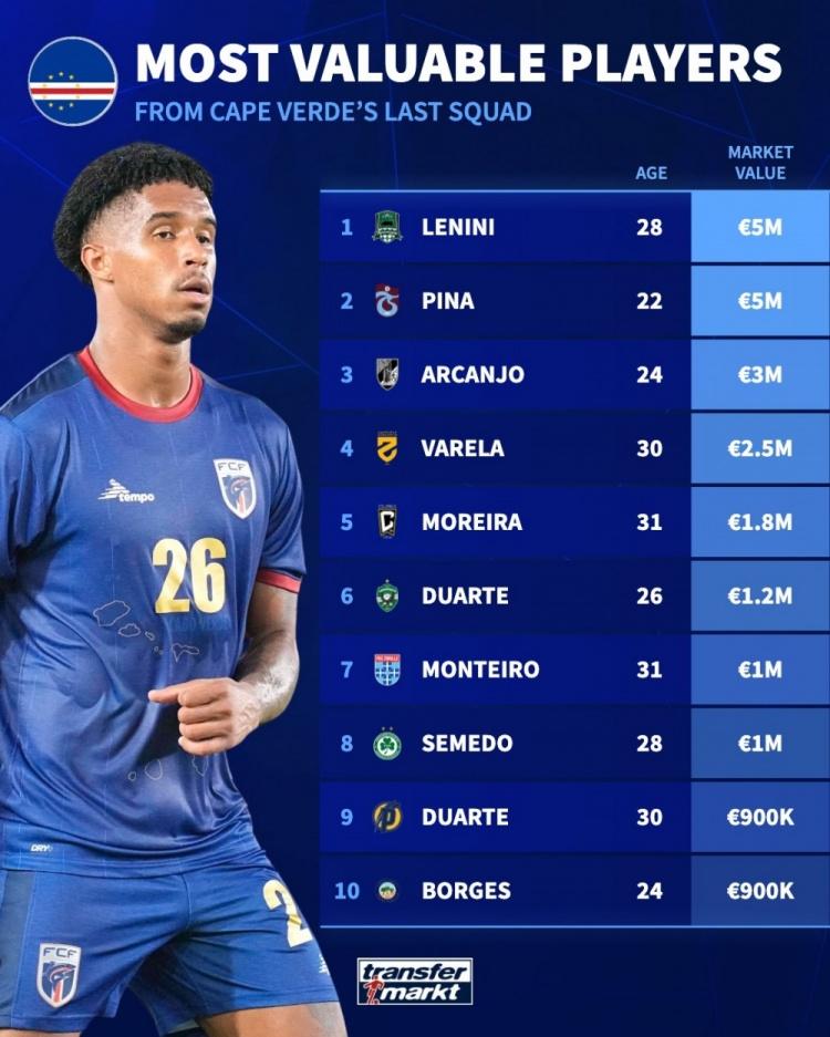 The most valuable players in Cape Verde are Lenini and Pina. Both of them are worth 5 million euros. Only 8 players are worth 1 million euros or more.