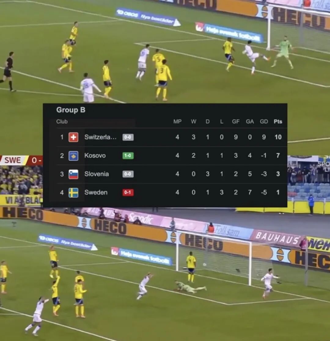 The Swedish team, ranked 32nd in FIFA, lost 0-1 at home to Kosovo, ranked 91st in FIFA. After the defeat, the Swedish team, which currently has only 1 point, has been determined to miss the World Cup directly. They are already 9 points behind the Swiss team at the top.