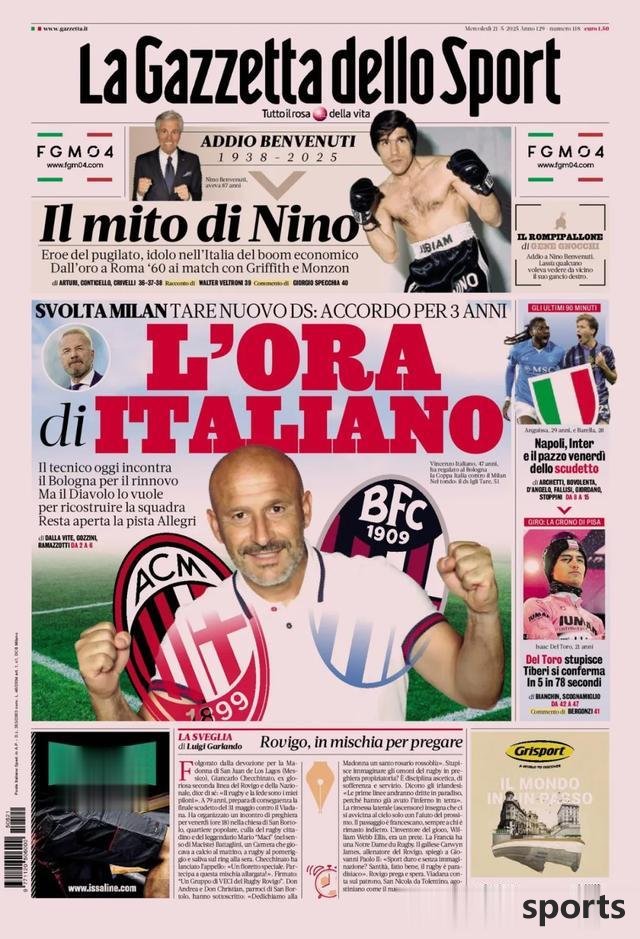 1, Italiano's time. Milan's turning point: Tare serves as the new sports director, reaching a three-year contract agreement. The coach met with Bologna today to discuss the contract renewal, but the Ross and Blacks hoped that he would come and rebuild. And the road in Allegri is still open.