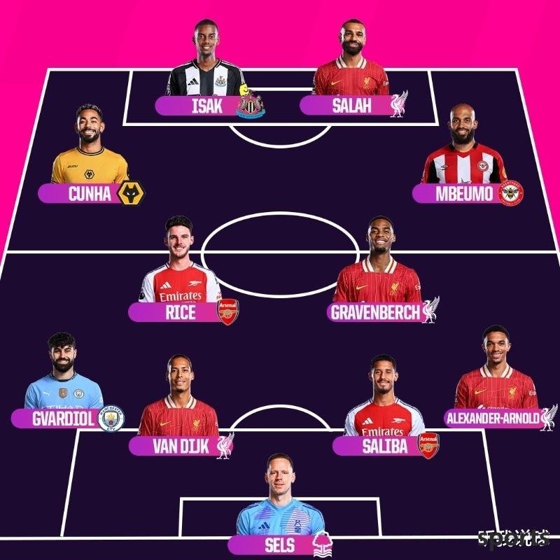 Goalkeeper: Sails (Nottingham Forest) defender: Gwadi Or (Manchester City), Van Dijk (Liverpool), Saliba (Arsenal), Arnold (Liverpool) Midfielder: Cunha: (Wolves), Rice (Arsenal), Heraffenberg (Liverpool), Mbemo (Brentford) Forwards: Isaac (Newcastle United), Salah (Liverpool)