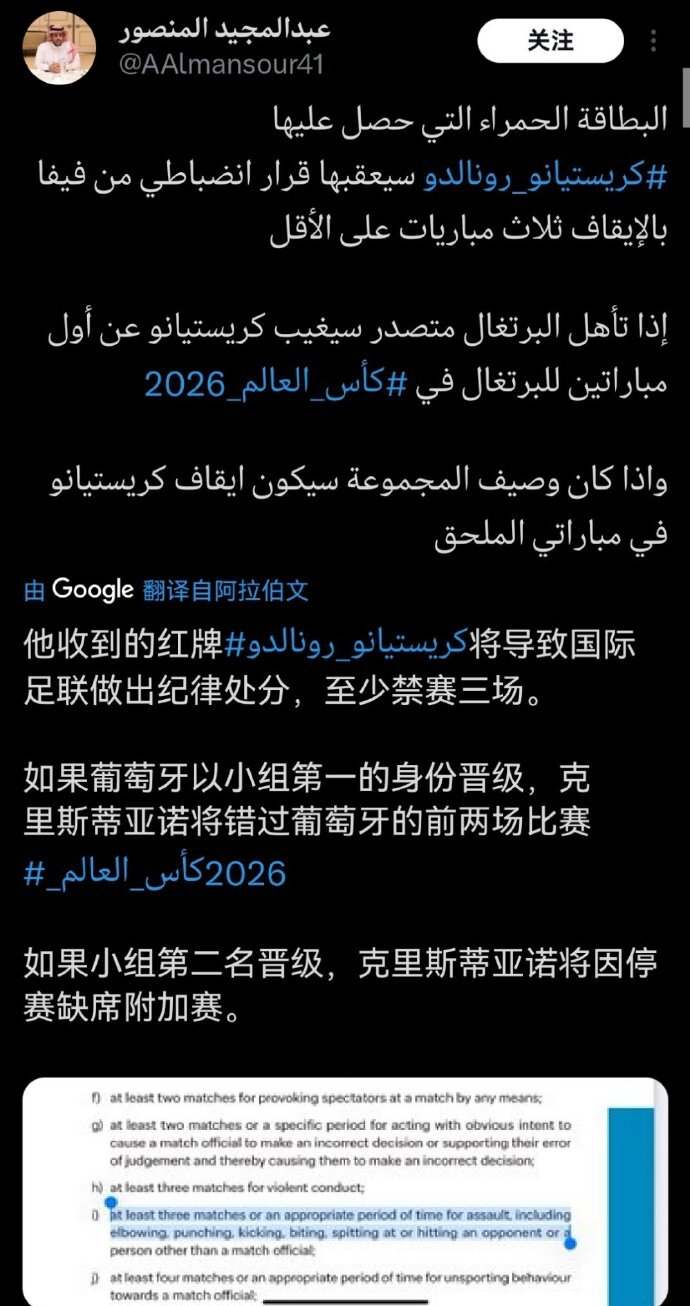 What makes Ronaldo even more frustrated is that Saudi sports lawyer Mansour revealed that Ronaldo was sent off for elbowing an opponent and received a red card, which is a violent act. According to the rules, FIFA will impose a penalty of at least three game suspensions.