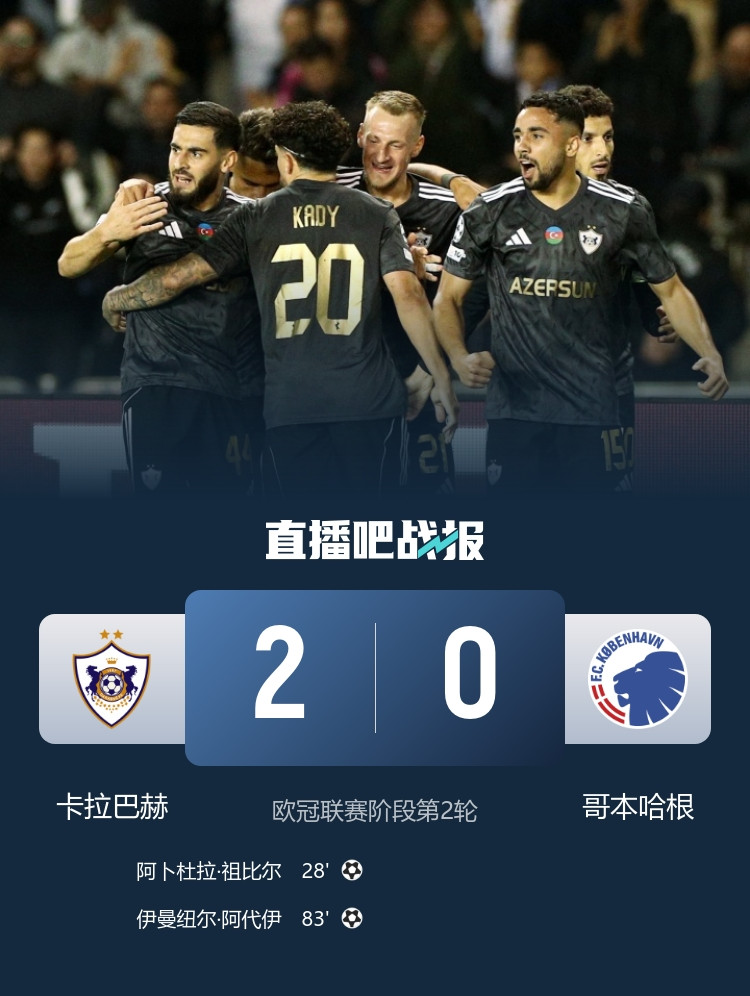 October 2nd NewsOctober 20:45 on October 2nd, the second round of the Champions League stage, Karabach played against Copenhagen at the Bakhramov Stadium. In the first half, Bikaro hit the post and Zubir scored the first record. Larson headed the ball to create a dangerous goal in the second half, and Adei's long-range shot expanded the score. In the end, Karabach won two consecutive Champions League wins 2-0.