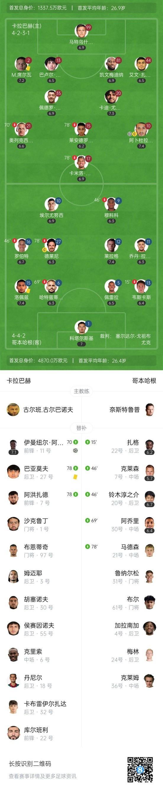 Karabach scored the first record in the 27th minute! Bikaro shot from the top of the right arc and hit the far post. Zubill scored a goal at the second point, and Karabach 1-0 Copenhagen. ↓